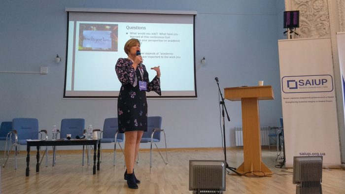 Про «Створення середовища доброчесності у навчанні» доповіла представниця наглядової ради Міжнародного центру академічної доброчесності (Канада, США) Тріша Бертрам Галлант.