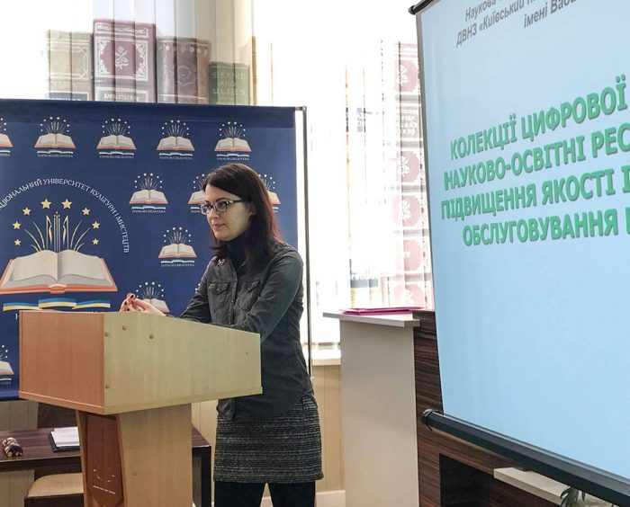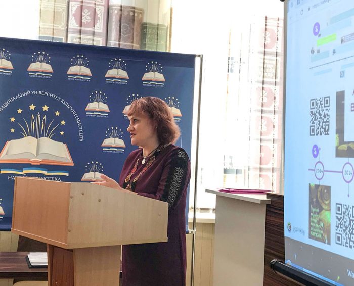 Олена Скаченко зробила огляд електронних інформаційних продуктів, які створені та використовуються в Науковій бібліотеці КНУКіМ для інтерактивного спілкування і зворотного зв’язку з користувачами.
