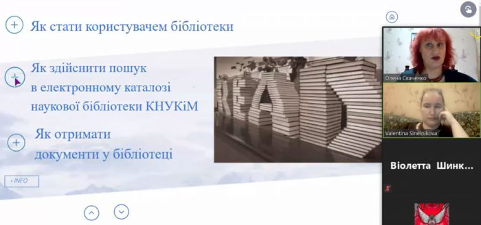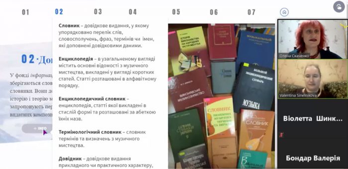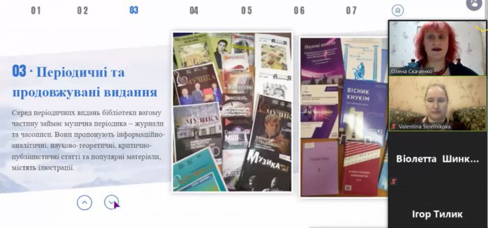 Під час відео-конференції Олена Олексіївна представила студентам та науково-педагогічним працівникам Факультету музичного мистецтва Інтерактивний інформаційний модуль «Музичні документи у фонді Наукової бібліотеки КНУКіМ» та охарактеризувала його 6 основних структурних частин.