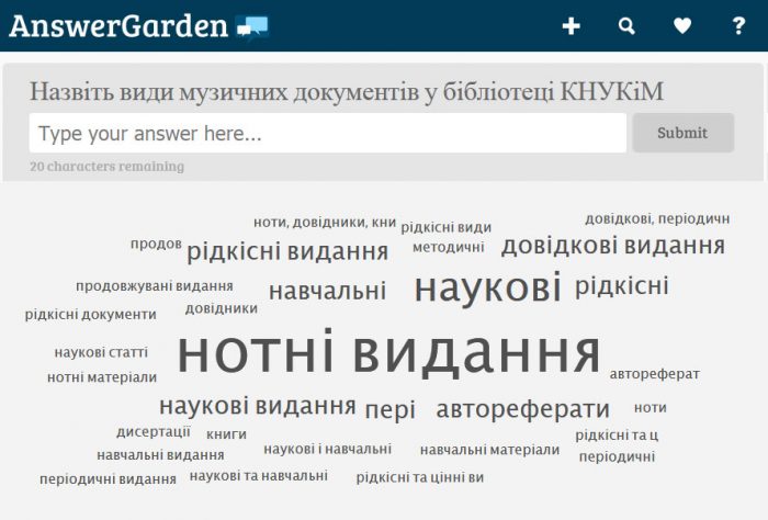 Наприкінці зустрічі Олена Олексіївна запропонувала студентам інтерактивне миттєве опитування для отримання зворотного зв’язку про інформацію, почуту і засвоєну під час онлайн зустрічі. Студенти мали відповісти на поставлене питання, скориставшись QR-кодом доступу до платформи AnswerGarden
