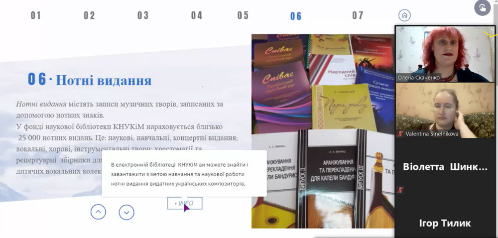 Під час відео-конференції Олена Олексіївна представила студентам та науково-педагогічним працівникам Факультету музичного мистецтва Інтерактивний інформаційний модуль «Музичні документи у фонді Наукової бібліотеки КНУКіМ» та охарактеризувала його 6 основних структурних частин.