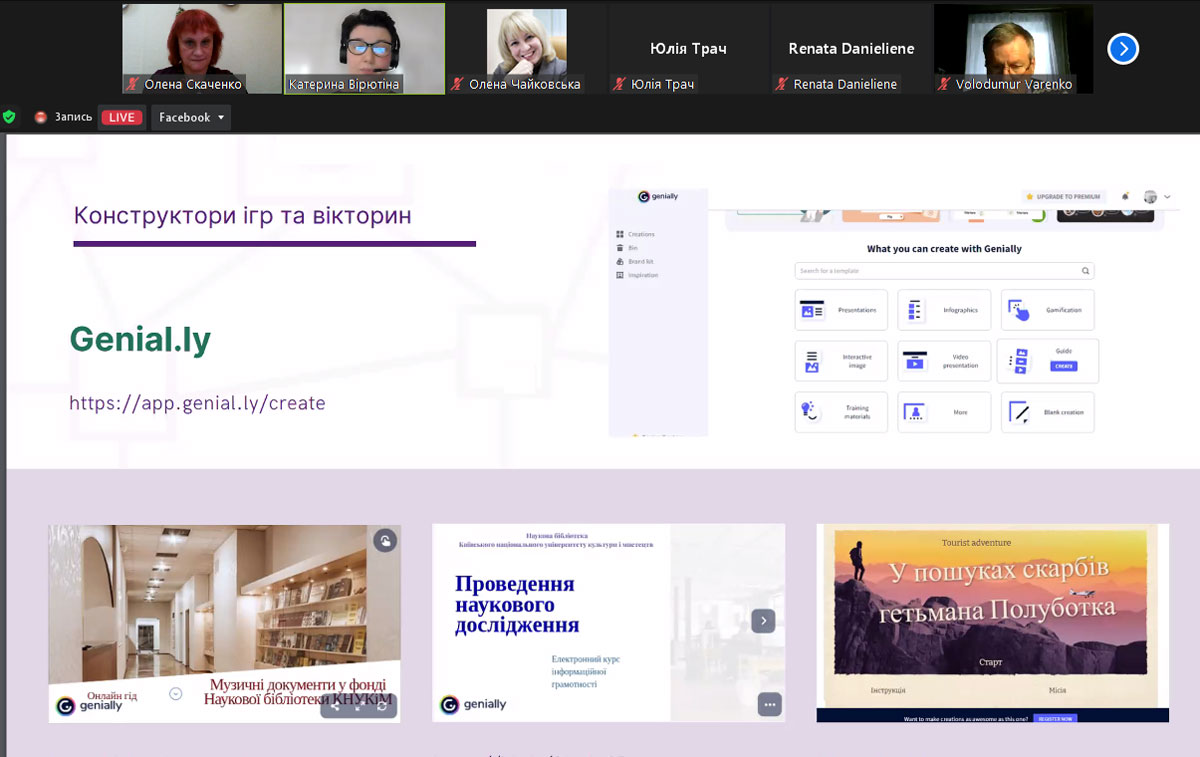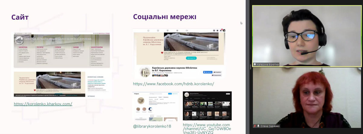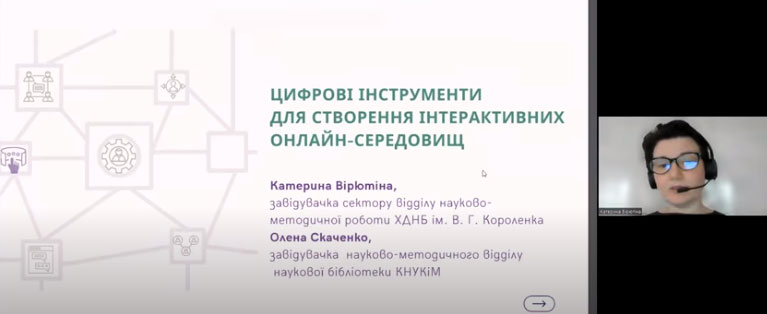 У доповіді «Цифрові інструменти для створення інтерактивного онлайн-середовища» спікерки поділился досвідом використання цифрових сервісів у роботі публічної та наукової бібліотек. Зокрема, навели приклади використання різноманітних конструкторів сайтів та блогів, онлайн-дошок, Google форм, онлайн-інструментів для дизайну і публікацій, конструкторів ігор та вікторин, тощо.