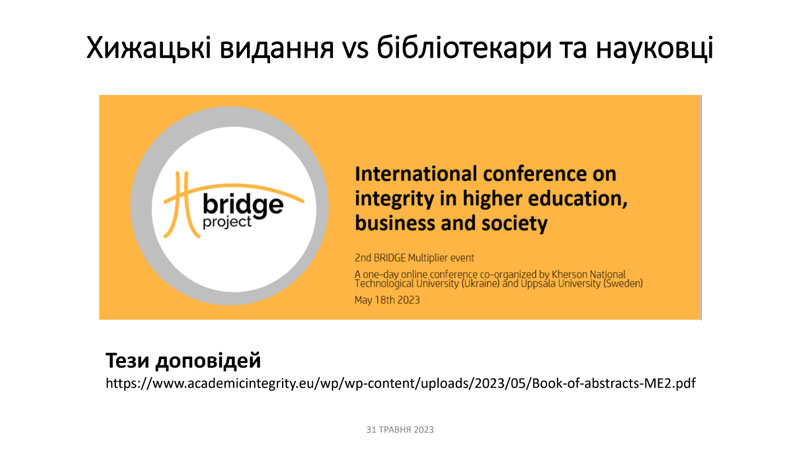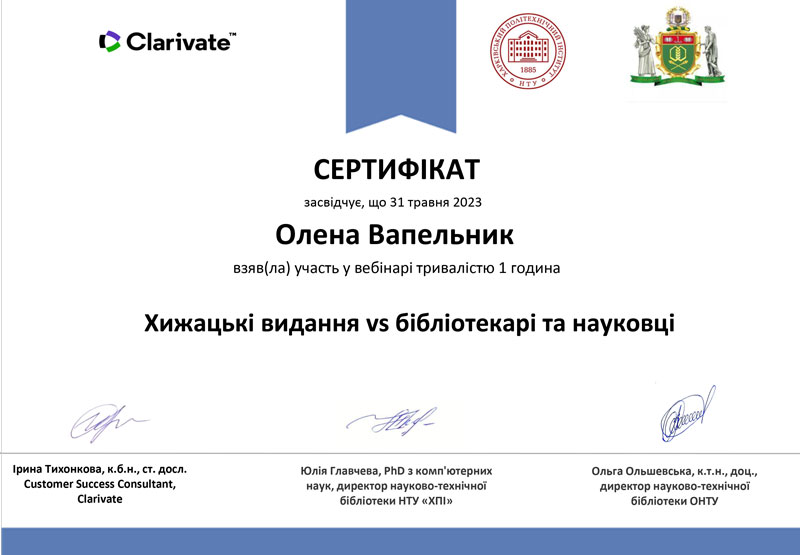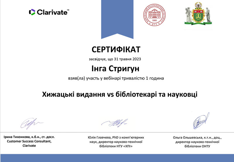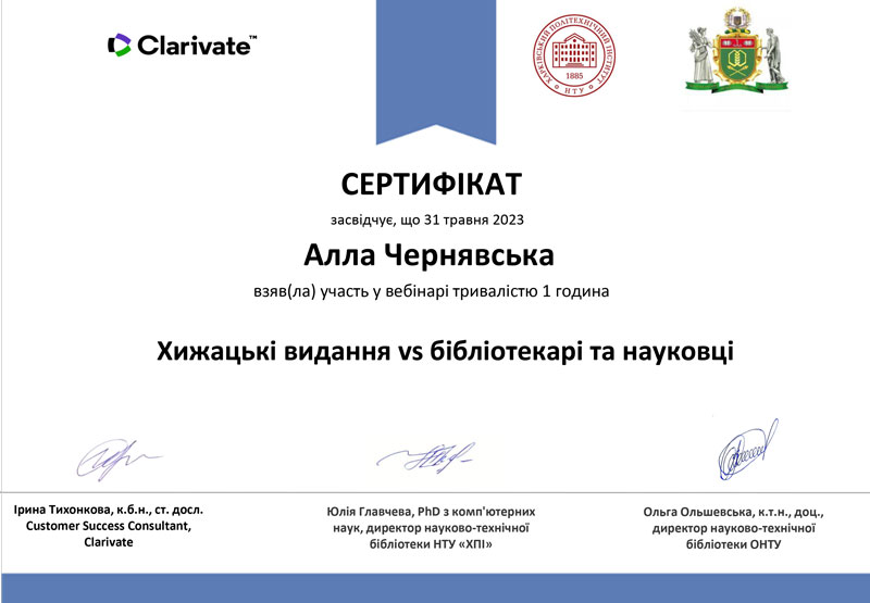 7 квітня 2023 року працівники Інформаційно-бібліографічного відділу Наукової бібліотеки Київського національного університету культури і мистецтв взяли участь у вебінарі на тему: «Хижацькі видання: розпізнати та уникнути», який організували і провели консультант компанії Clarivate Ірина Тихонкова cпільно з директорами наукових бібліотек Юлією Главчевою (НТУ «ХПІ) та Ольгою Ольшевською (ОНТУ).