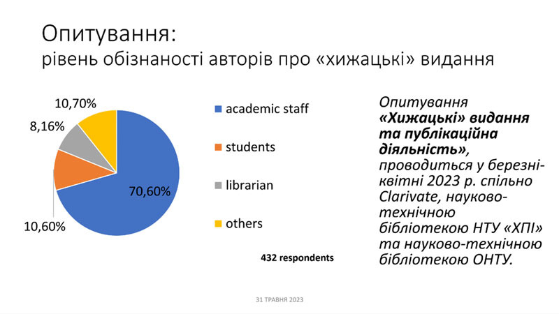 На вебінарі учасники/слухачі ознайомились з основними типами хижацьких видань, було заслухано практичний досвід роботи наукових бібліотек Національного технічного університету «Харківського політехнічного інституту» та Одеського національного технологічного університету щодо допомоги науковцям щодо підбору видання для публікацій.