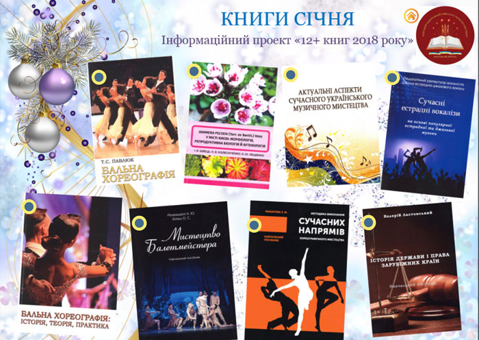 Наукова бібліотека Київського національного університету культури і мистецтв продовжує інформаційний проект «12+ книг … року». У січні презентуємо нові видання науковців університету: монографії, колективні монографії, навчальні посібники та ноти.