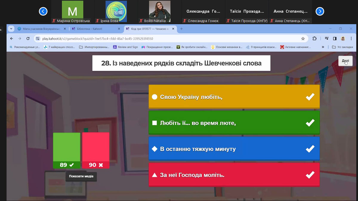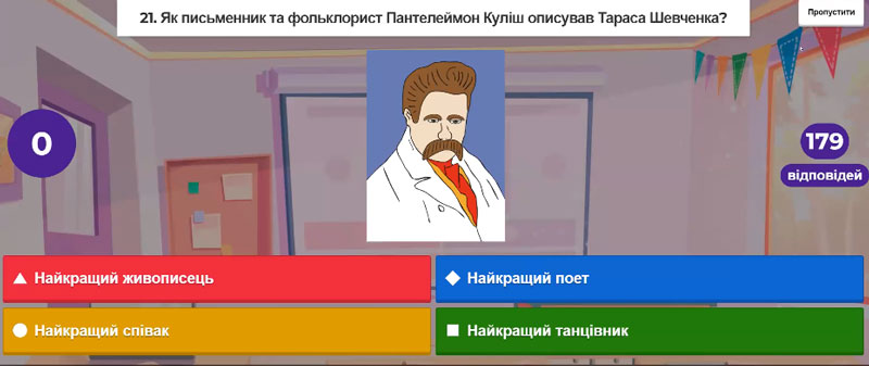 Вікторина на платформі Kahoot зібрала 179 гравців із 24 закладів освіти України. 30 питань вікторини стосувалися творчості та вшанування Тараса Шевченка.