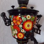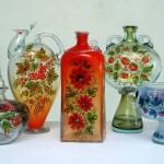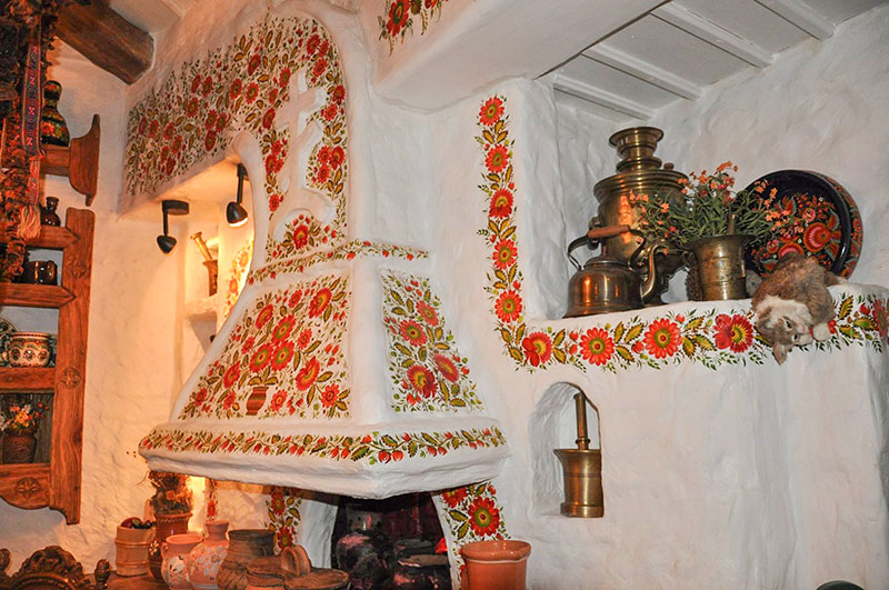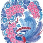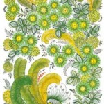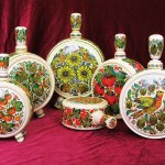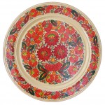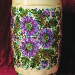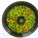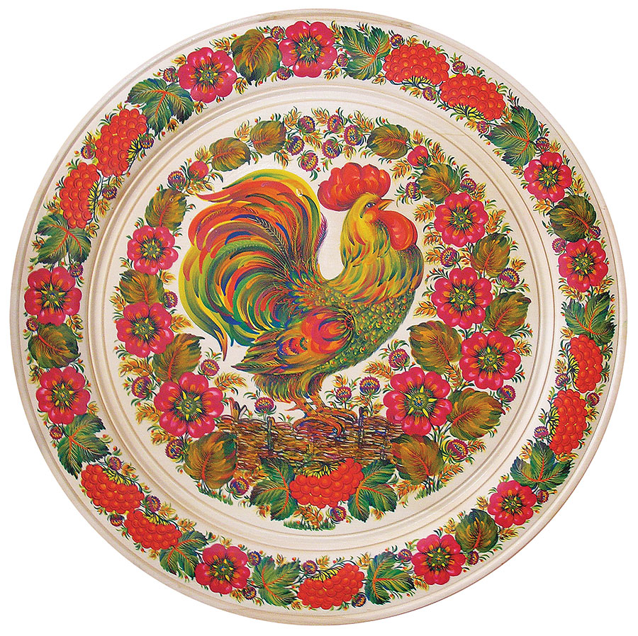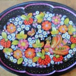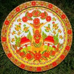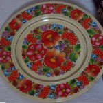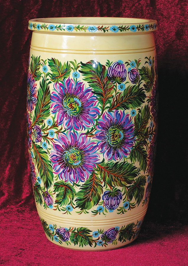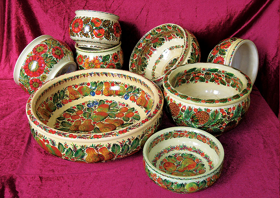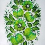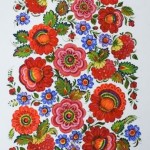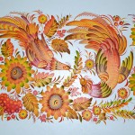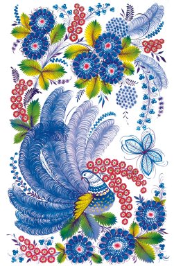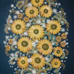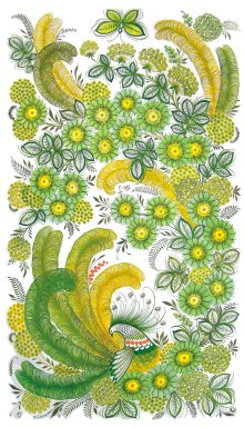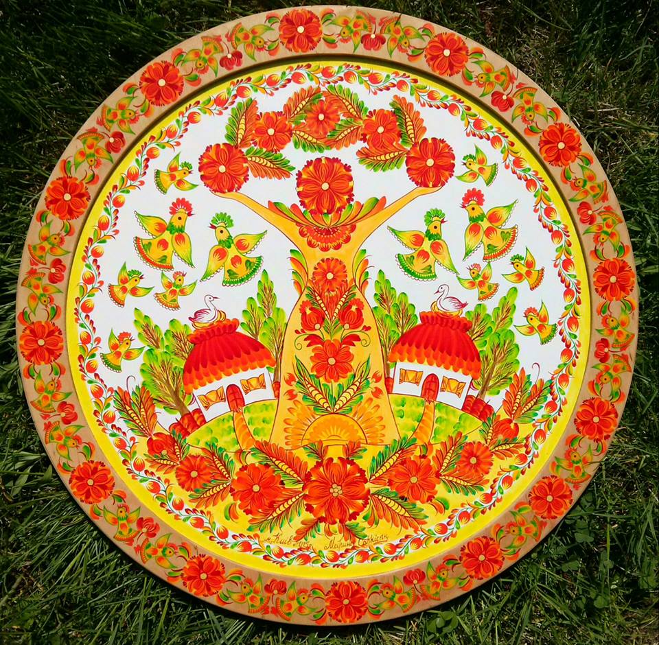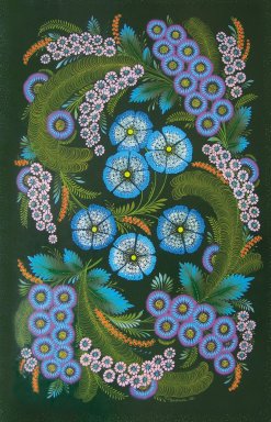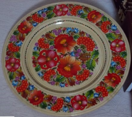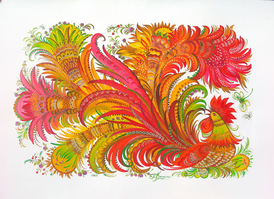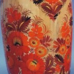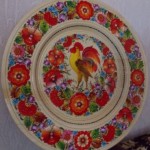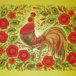 Creates traditional Petrykivka malyovky – paper wall panels, and decorative vases and plates with bright flowers and fantastic pea cocks as well.