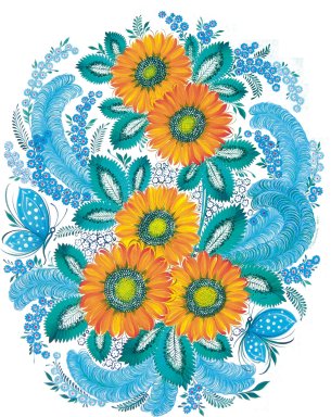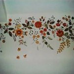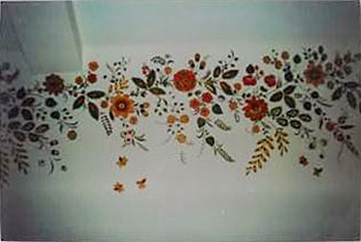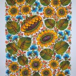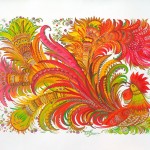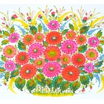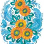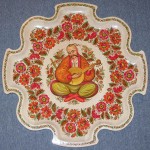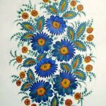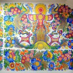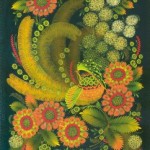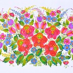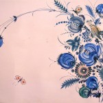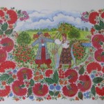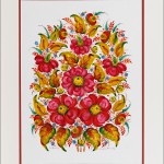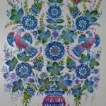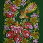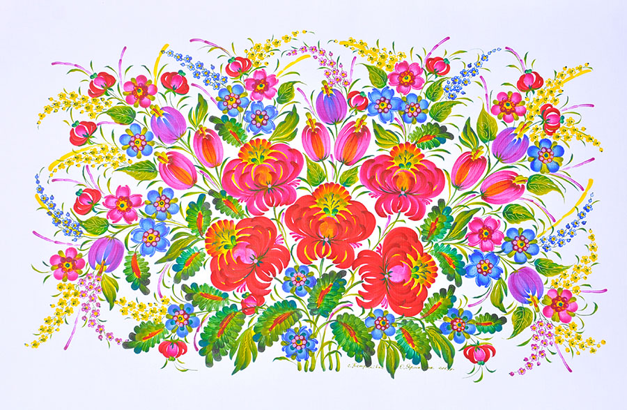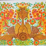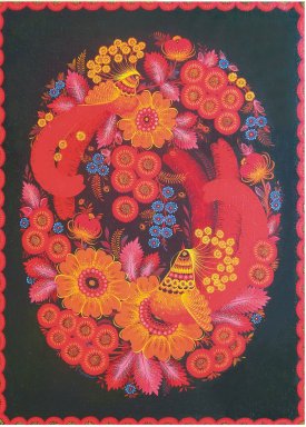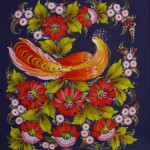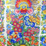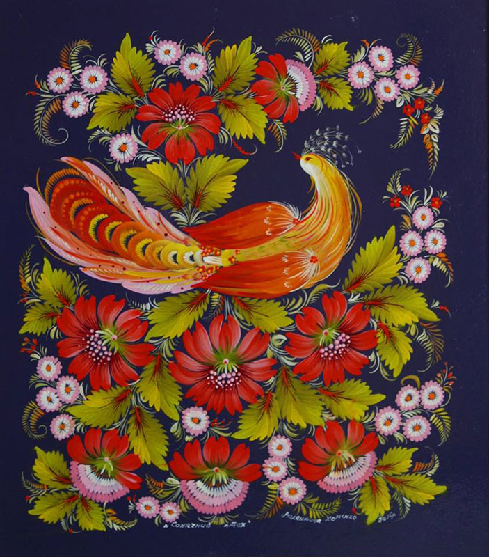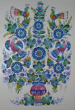 The craftswoman embodies Petrykivka on various materials: paper, wood, interior walls. The favorite subjects: the variety of flowers, herbs –everything that makes native Prydniprovya unique and picturesque corner. Likes to create panels with charming birds and story panels with Ukrainians. One can observe in her works, how the mastery formation occurs in compositional colored decorative ornament decision, in which the main role is given to the color and rhythmic harmony of plastic vocabulary.