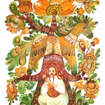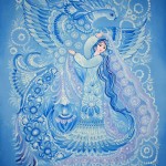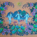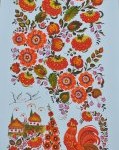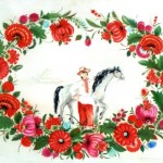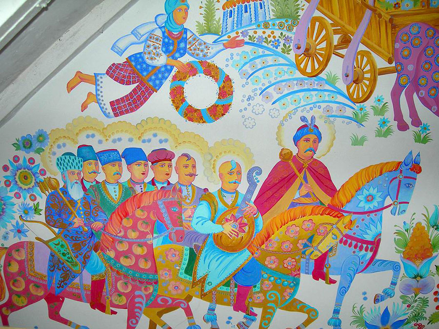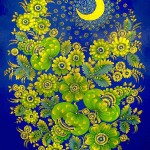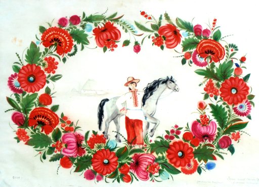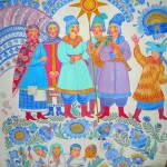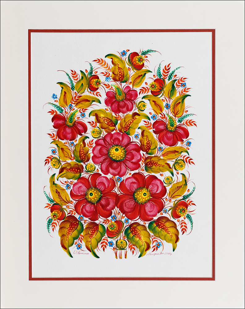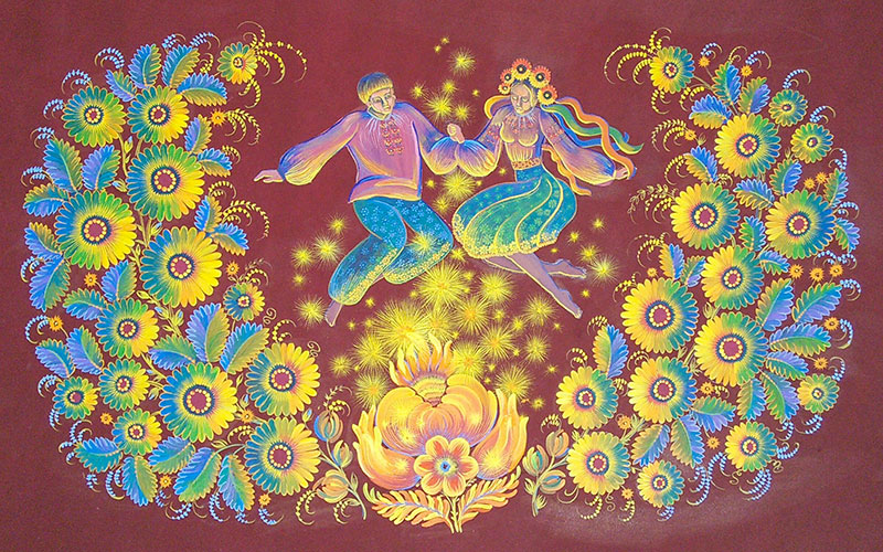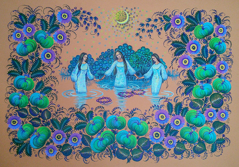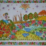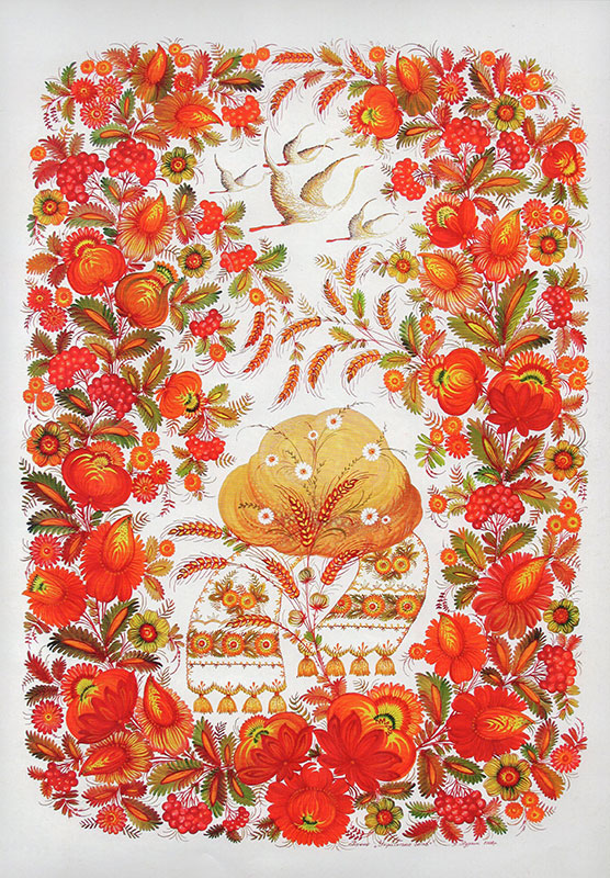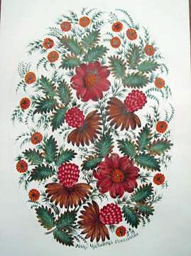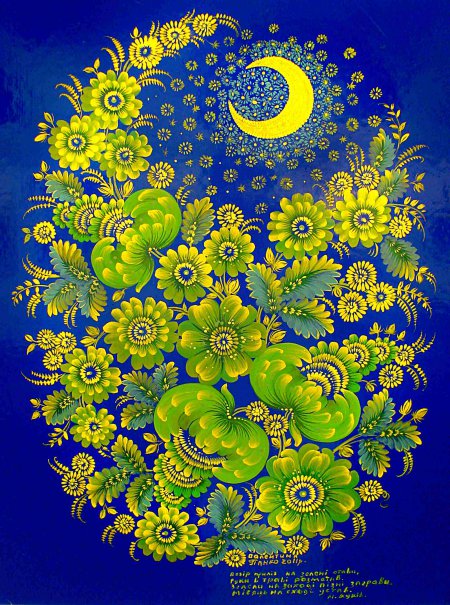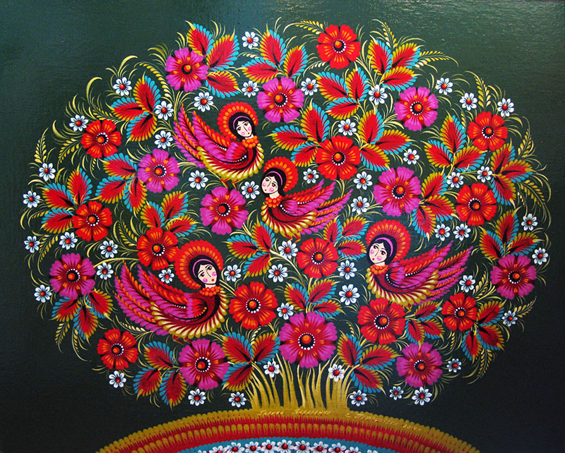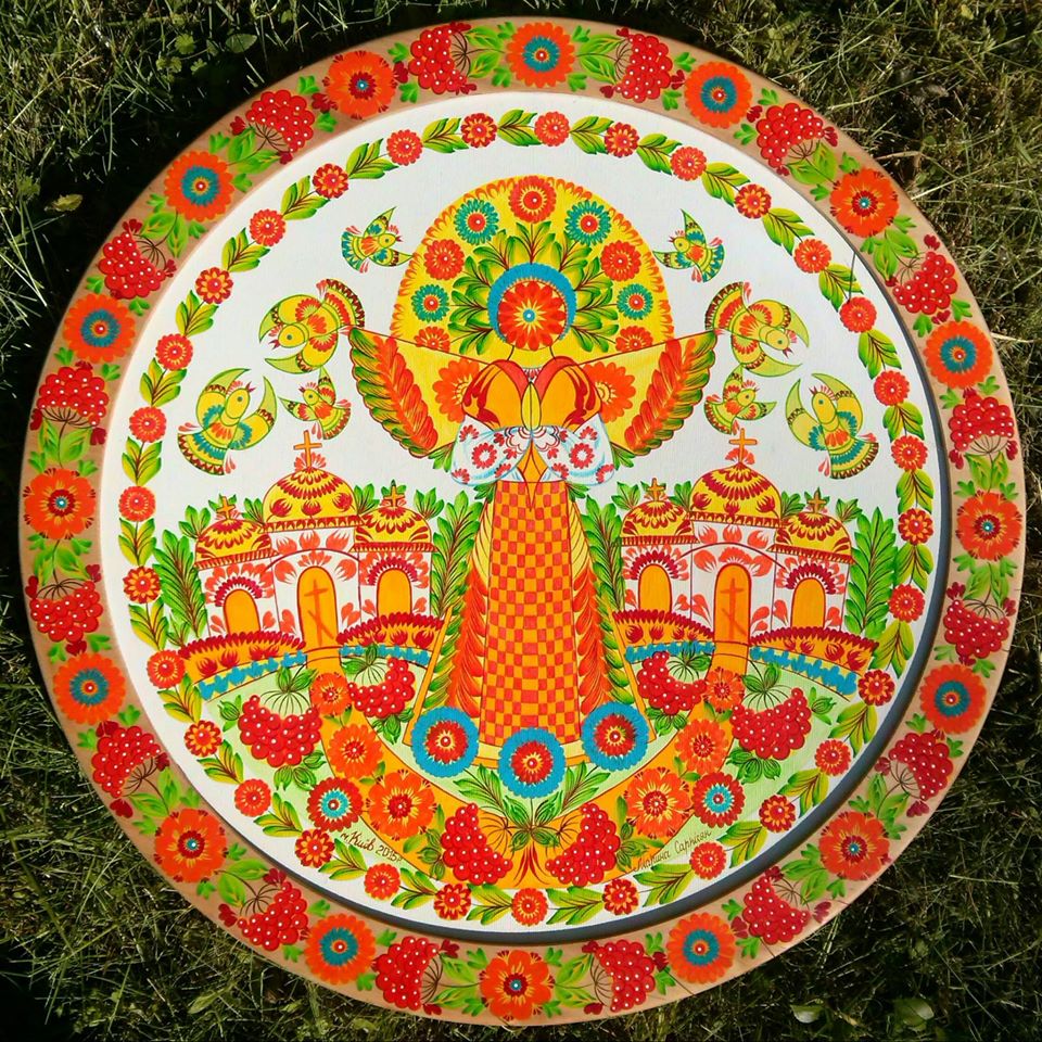 Embodies «Petrykivka» on various materials: paper, wood, glass, interiors’ walls. The Ukrainian countryside, flowers, Cossack Mamay are among the favorite subjects. In recent years tends to religious themes. Christmas, Easter, Intercession of the Theotokos, angels are on her paintings.