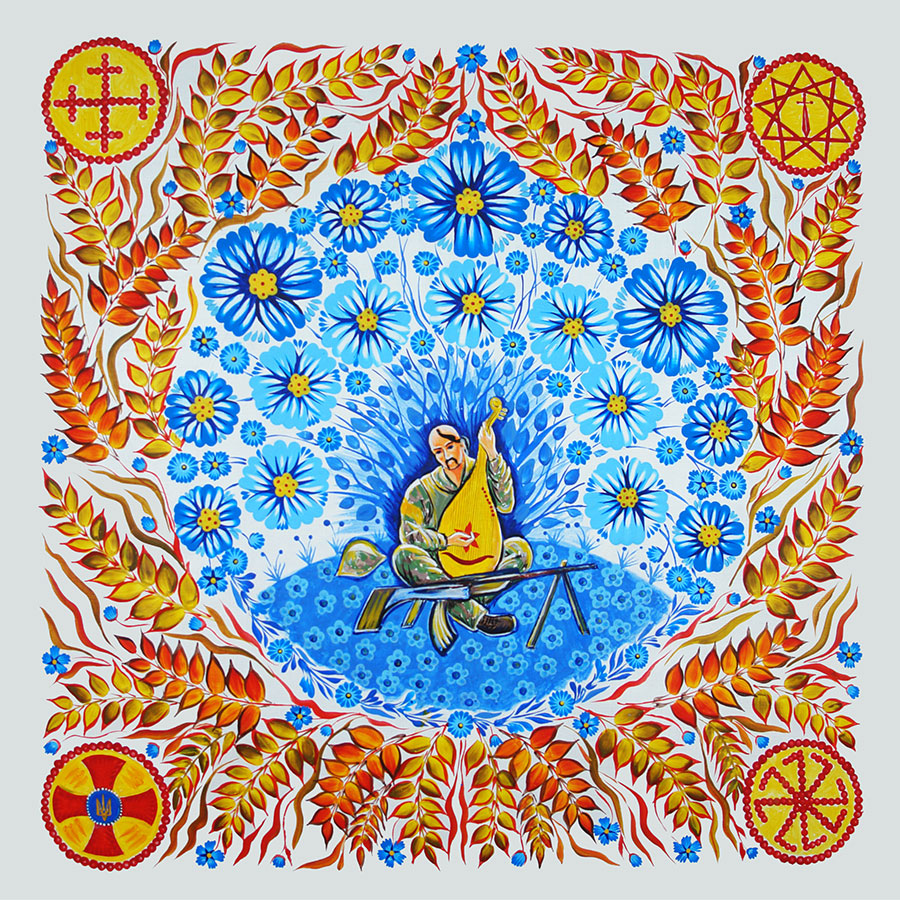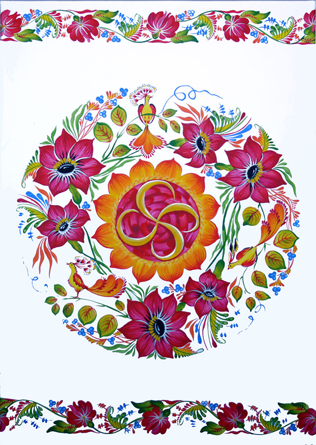 Besides the traditional Petrykivka themes, the artist uses Slavic symbolics and themes of the Ukrainian history in her works.