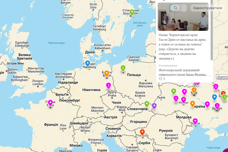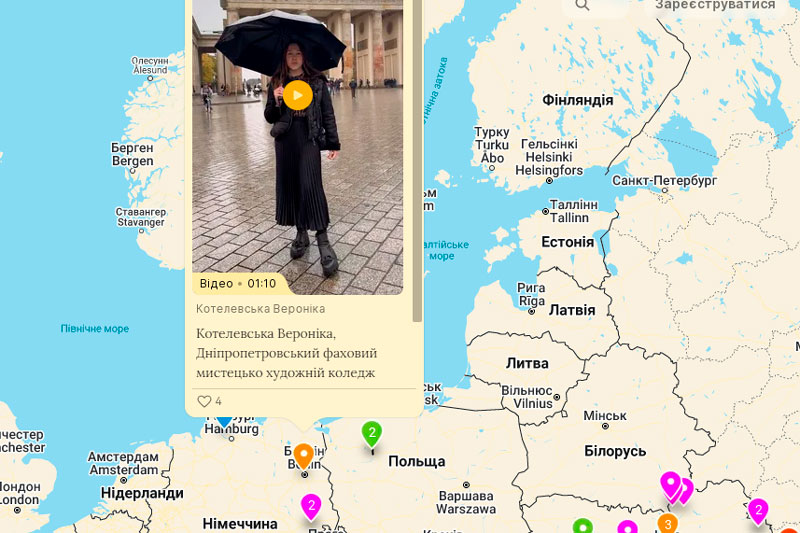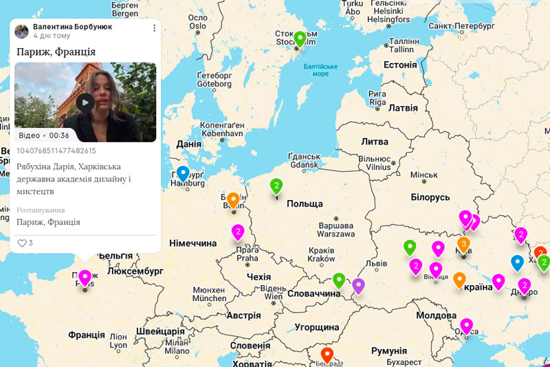 Крім того, студенти, які навчаються за кордоном, пройшлися вулицями міст, де вони перебувають зараз і відзняли відео про пам’ятки та культурні особливості цих країн. На мапі турніру можна переглянути візитки про Німеччину – презентовані Дрезден (Ларіна Еліна, Харківська державна академія дизайну і мистецтв), Гамбург (Гапченко Діана, Харківський НПУ імені Григорія Сковороди) і Берлін (Котелевська Вікторія, Дніпропетровський ФМХКК), Словаччину (Гарапко Мар’яна, Мукачівський державний університет), Сербію (Клюєв Михайло, Дніпропетровський ФМХКК), Польщу (Пилипюк Тетяна, Дніпропетровський ФМХКК), Францію (Рябухіна Дарія, Харківська державна академія дизайну і мистецтв) та Швецію (Скаченко Анастасія, Rudbeck, Sollentuna kommuns gymnasium).
