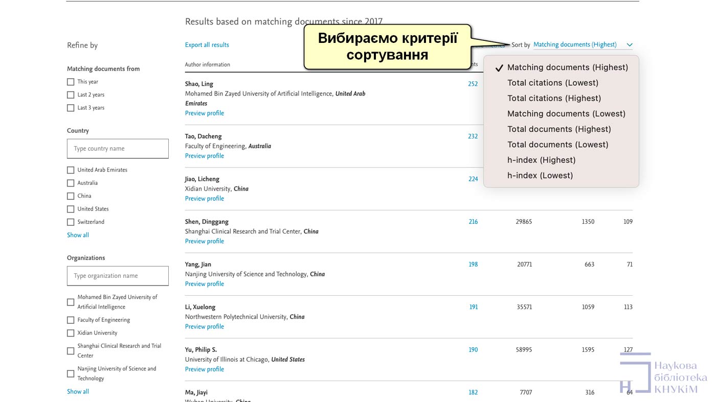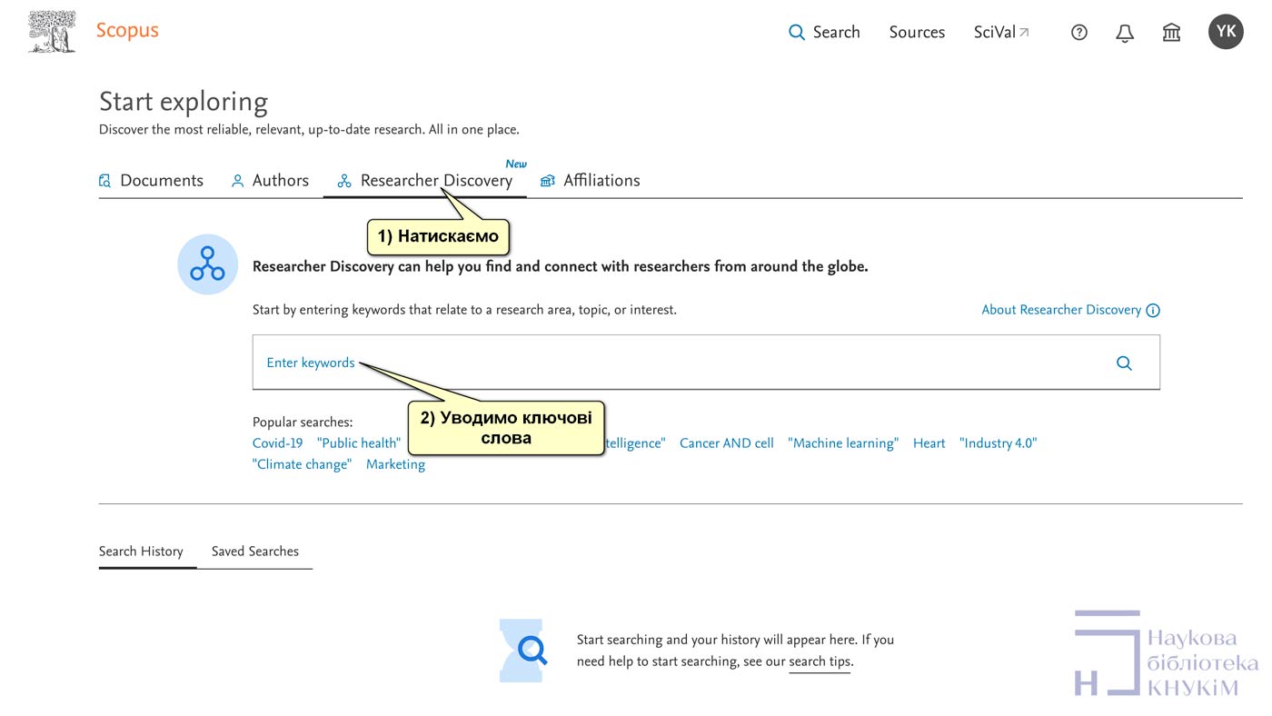 Scopus Researcher Discovery заснований на високоякісній глобальній базі даних профілів авторів Scopus, має спрощений інтерфейс, який допоможе швидко отримати результати, а також фільтри й ідеї, що допоможуть звузити коло дослідників. Цей підхід, заснований на даних, дасть змогу знайти потенційних співавторів і створити ґрунтовні дослідження.