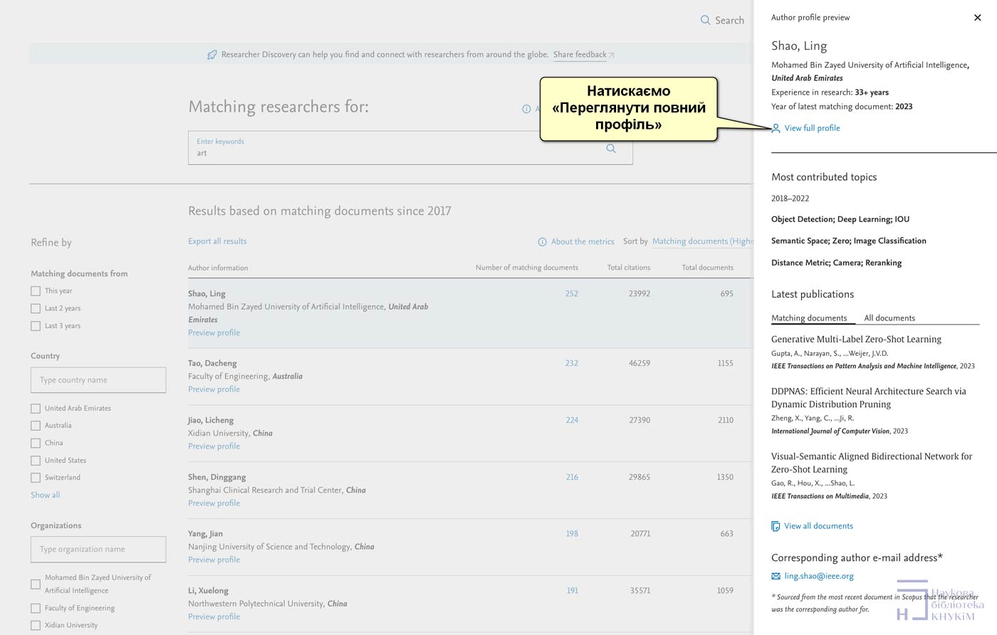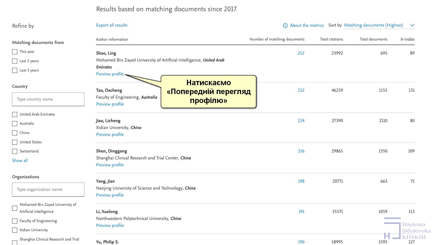 Натисніть на «Попередній перегляд профілю» («Preview Profile»), щоб переглянути коротку інформацію про автора, охоплюючи останню приналежність, роки досвіду та рік останнього документа, а також найпопулярніші теми, останні публікації та адресу електронної пошти.