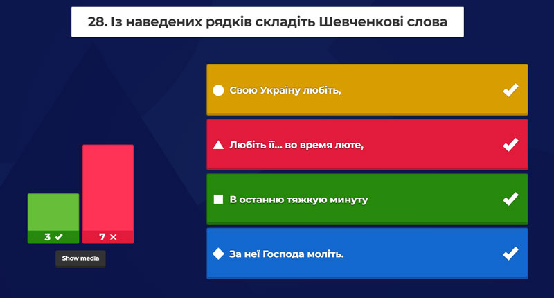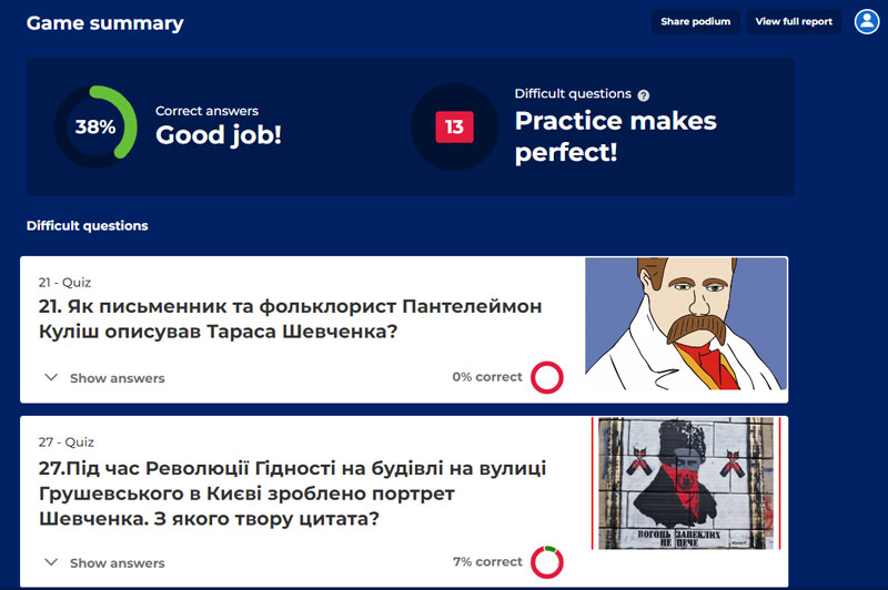 Під час Розминки «Цифри у житті Шевченка» учасники відповідали на питання. Далі, на платформі Kahoot здобувачі освіти змагалися в онлайн вікторині «200 років слави». Перемогу здобула Бєлова Меланія (18 414 балів), друге місце посів Богдан Пермінов (16 466), третє – В.Голопьоров (15 606).