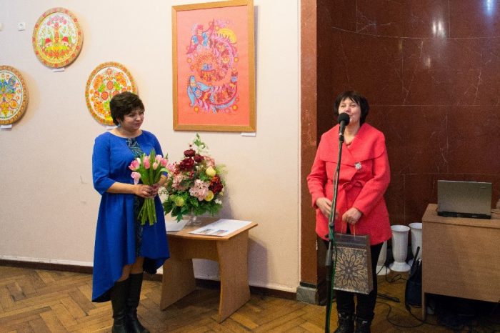 На виставці представлено близько 60 робіт художниці, виконаних у стилі петриківського розпису.