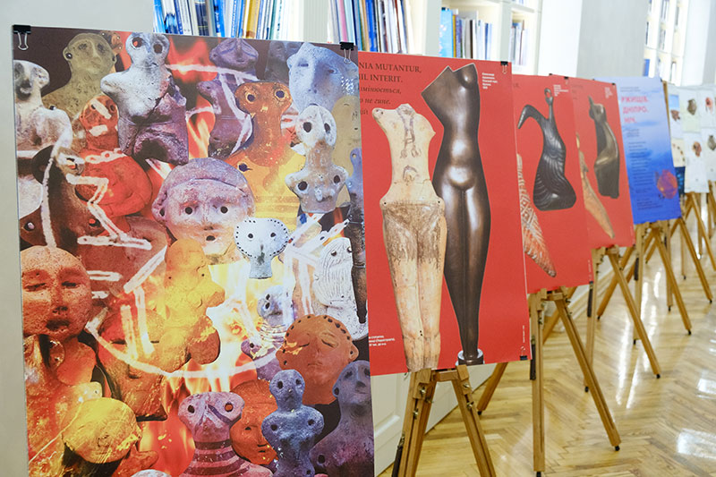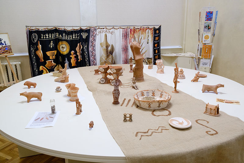 Виставка керамічних виробів Людмили Смолякової організована у просторі для круглих столів і конференцій. На виставці представлені керамічні реконструкції археологічних артефактів Трипільської культури.