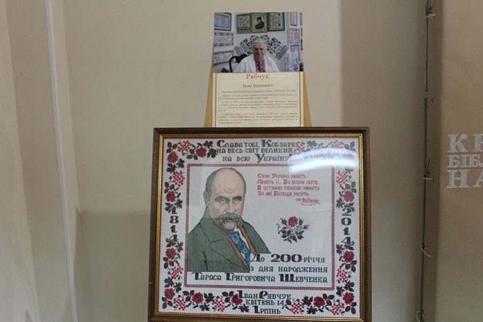 Не пустувала і Art-галерея бібліотеки, де з 23 квітня діяла виставка «Вишитий Кобзар» – спільний проект відомого в Україні майстра вишивки Івана Рябчука, музеєзнавців та краєзнавців з м. Ірпінь, що на Київщині. Кожна картина – то вірш із Шевченкового «Кобзаря». Водночас це не просто текст, а змістовний настрій, який створено за допомогою квіткового орнаменту, візерунків, що народжені в душі митця поетичним словом. Роздуми, викликані віршами Шевченка лягли на картини коментарями автора, або епіграфами (вишиті вони чорною ниткою на відміну від віршів Шевченка, які «прописані» червоною). Вишита шевченкіана Івана Рябчука налічує близько 40 полотен, а загальна кількість його робіт – понад сто.