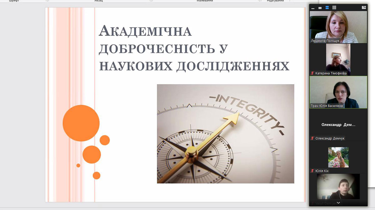 На початку тижня обговорили «Академічну доброчесність у наукових дослідженнях» разом із проректоркою з наукової роботи, докторкою культурології, професоркою Юлією Василівною Трач.