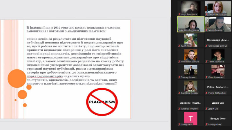 Спікерка розповіла про особливості дотримання й сприяння розвитку академічній доброчесності в різних країнах світу та Україні, пояснила різницю між плагіатом і самоплагіатом та познайомила з програмним забезпеченням, яке використовується в Україні для викриття академічної недоброчесності.