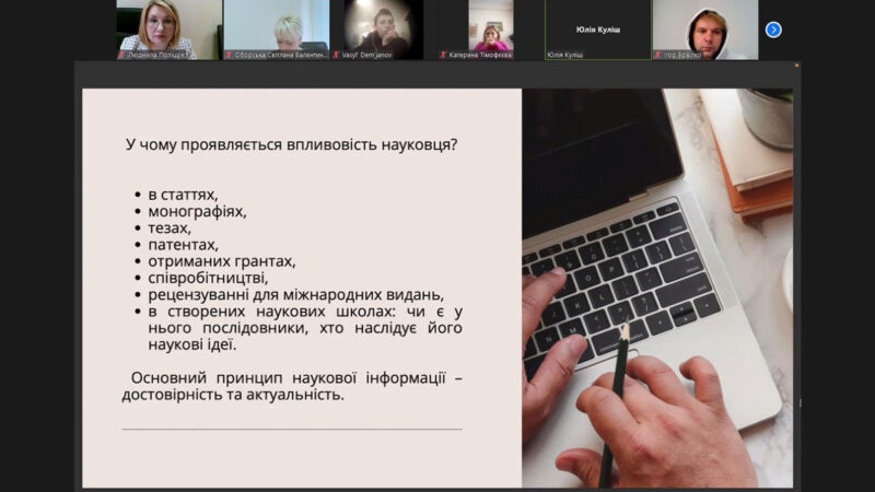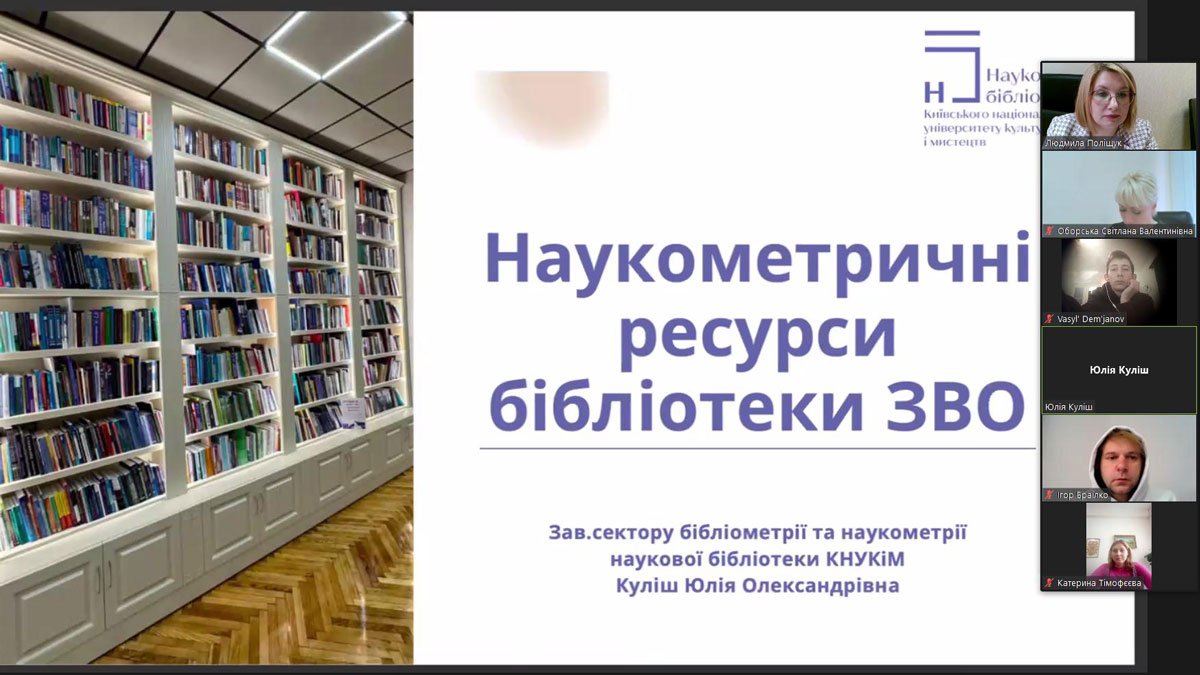 У вівторок разом з науковою бібліотекою КНУКіМ провели майстер-клас «Наукометричні ресурси бібліотеки закладу вищої освіти». Завідувачка сектору бібліометрії та наукометрії Юлія Олександрівна Куліш розповіла про наукометрію, яка є одним із ключових напрямів діяльності наукової бібліотеки КНУКіМ, про наукометричні бази і як ними користуватися для навчання або написання кваліфікаційних робіт.