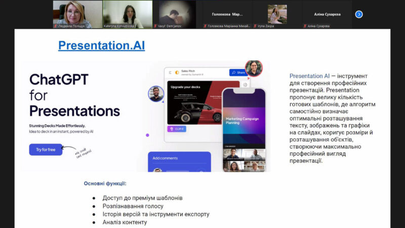 На воркшопі «Практичне використання штучного інтелекту в освітньому процесі» завідувачка кафедри комп’ютерних наук, кандидатка технічних наук, доцентка Катерина Іванівна Коцюбівська практично показала, як під час навчання можна користуватися штучним інтелектом. Зокрема розповіла, як правильно писати запити (промти), які сайти краще використовувати, які є платформи зі штучним інтелектом для ефективного навчання.