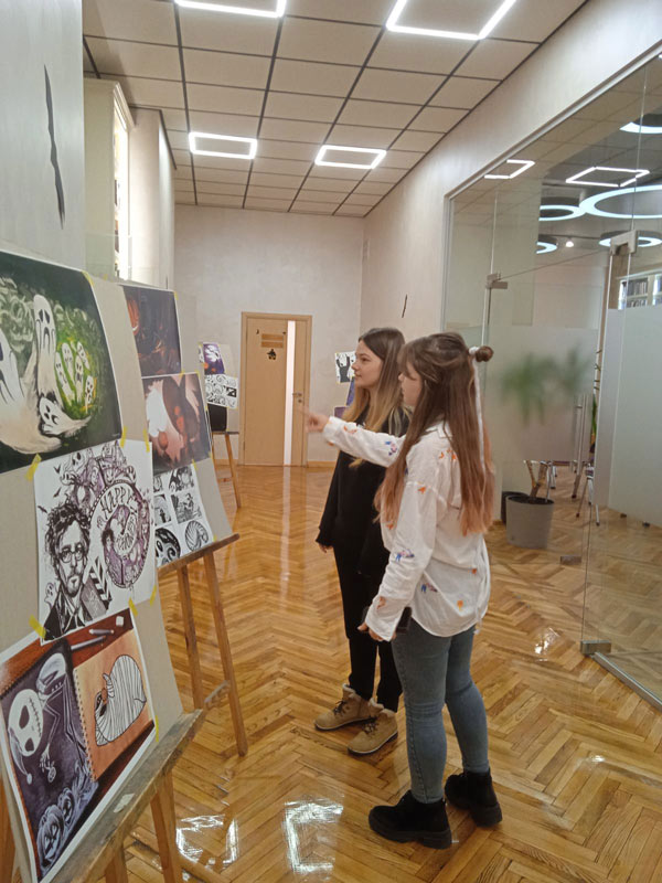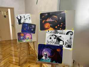 Так, за сприяння викладачів кафедри графічного дизайну Оксани Чуєвої та Аркадія Болтенкова були презентовані творчі плакати студентів 3 курсу на тему Хелловіна та організована виставка робіт студентів 1 курсу, яка презентувала різновиди та особливості класичної техніки створення об’ємних рухливих ілюстрацій у форматі «pop-up» (означає – раптово з’являтися, вискакувати).